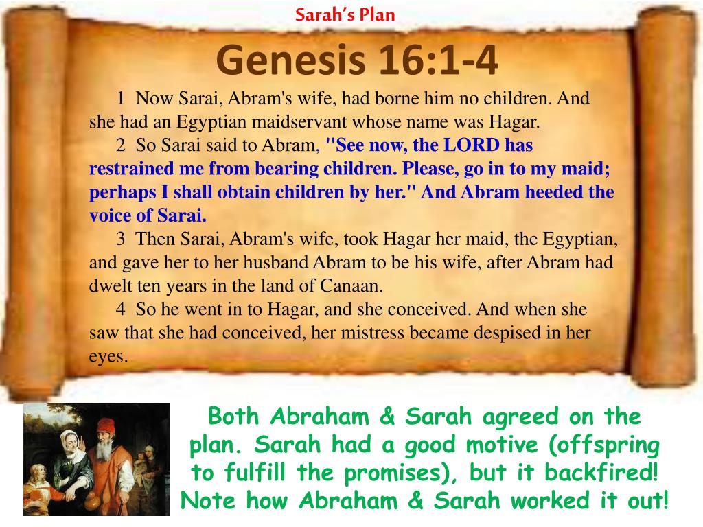 Now Sarai, Abram’s wife, had borne him no children. And she had an Egyptian maidservant whose name was Hagar. So Sarai said to Abram, “See now, the Lord has restrained me from bearing children. Please, go in to my maid; perhaps I shall obtain children by her.” And Abram heeded the voice of Sarai. Then Sarai, Abram’s wife, took Hagar her maid, the Egyptian, and gave her to her husband Abram to be his wife, after Abram had dwelt ten years in the land of Canaan. So he went in to Hagar, and she conceived. And when she saw that she had conceived, her mistress became despised in her eyes. Genesis 16 : 1 – 4 NKJV